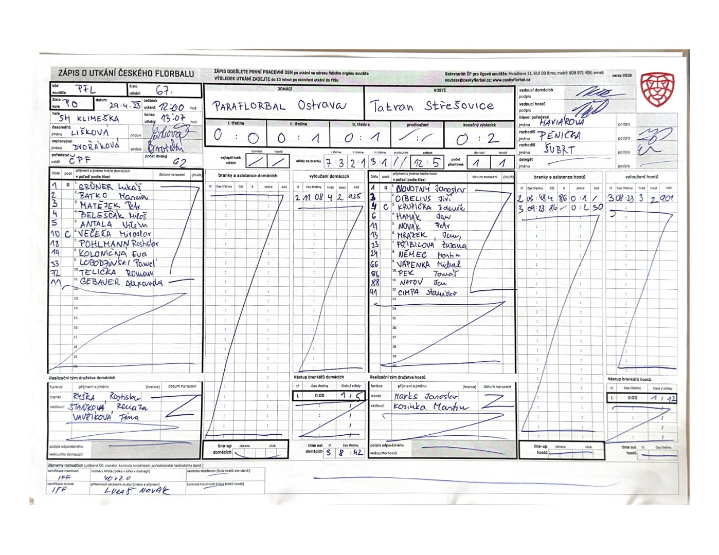 | 0:0 | 1 | 00:00 | začátek 2. semifinálového zápasu mezi Tatranem Střešovice a Paraflorbalem Ostrava | |||||