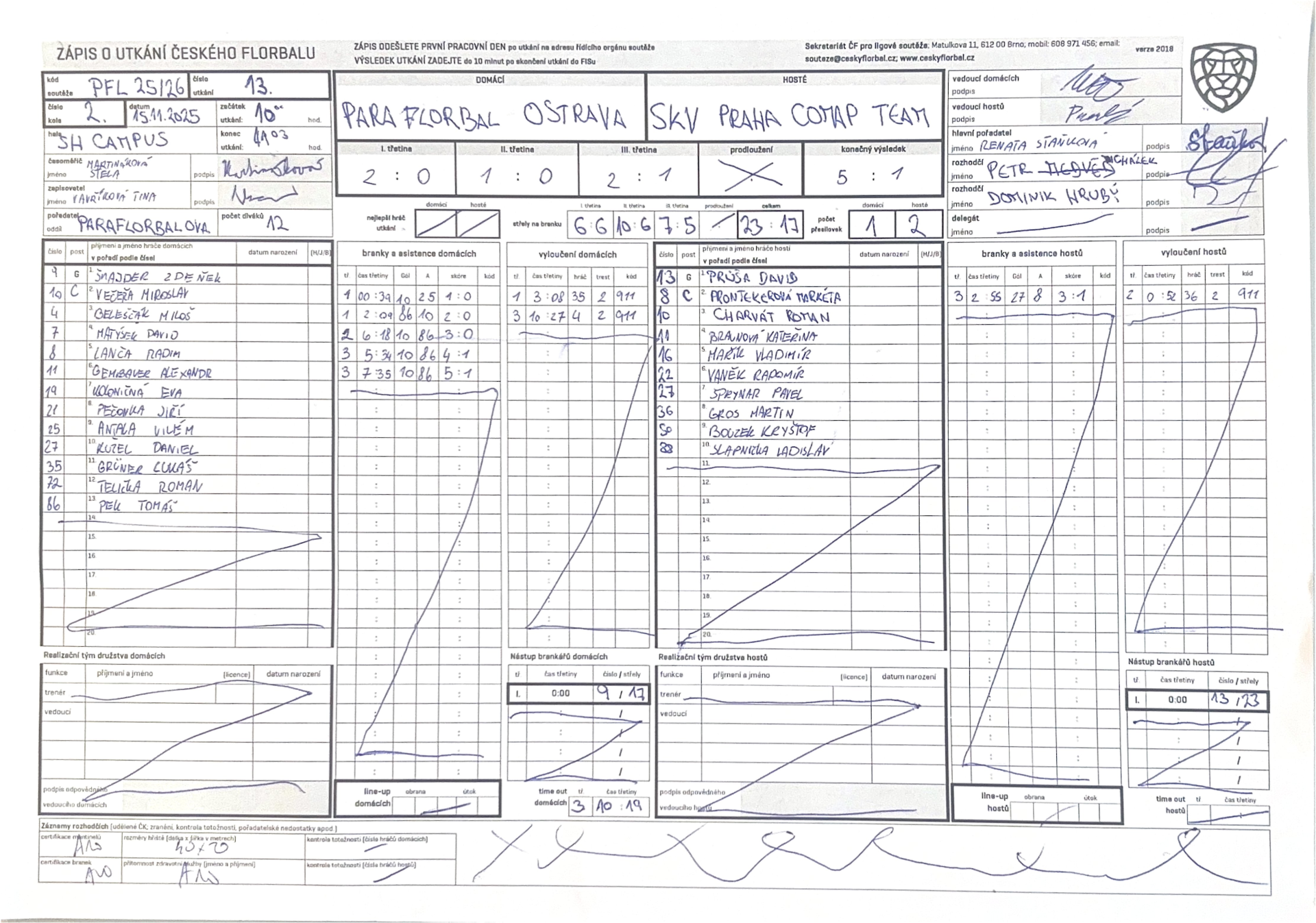 | 5:1 | 3 | 10:19 | Tým PARAFORBAL Ostrava si vzal oddechový čas | |||||